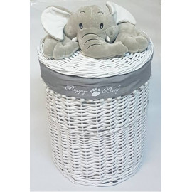Корзина для белья белого цвета из цельной лозы с вязанной игрушкой Медведь..